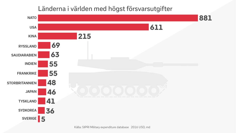 Bild: Länder med högst försvarsutgifter angett i miljarder